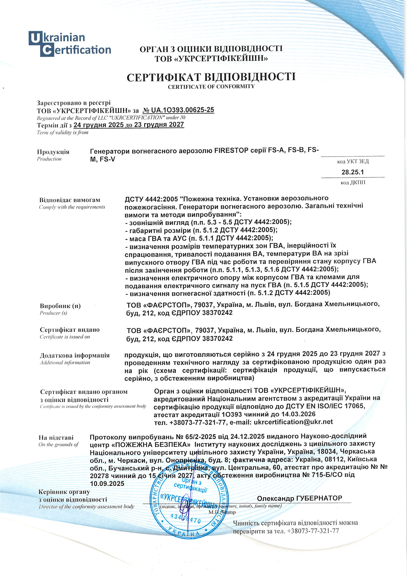 | Огнетушащая способность аэрозоля | 0,05 кг/м3 |